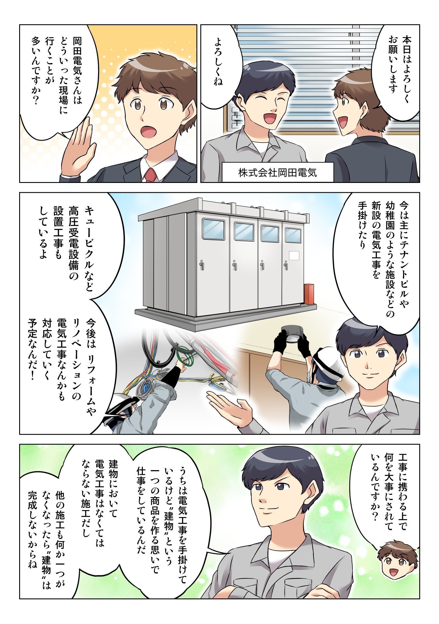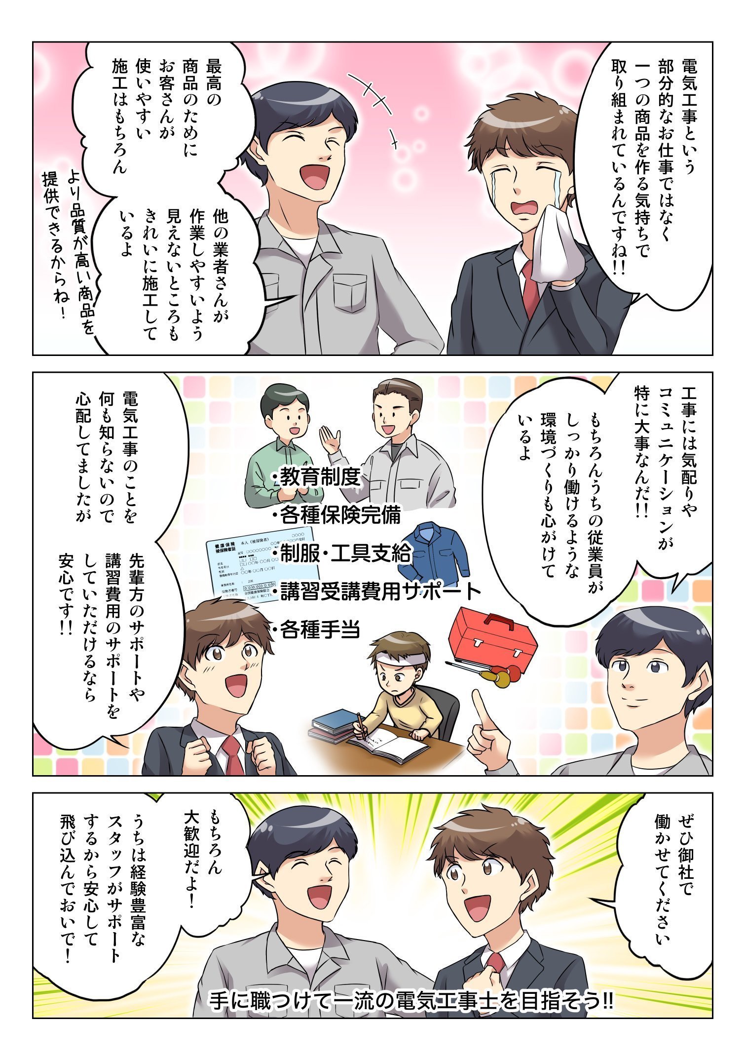 岡田電気では社会人のマナーはもちろん、仕事に対する考え方から現場の作業まで一から丁寧に指導いたします。未経験でも安心して始められる環境があるので、何の心配もいりません。安心して飛び込んできてください。